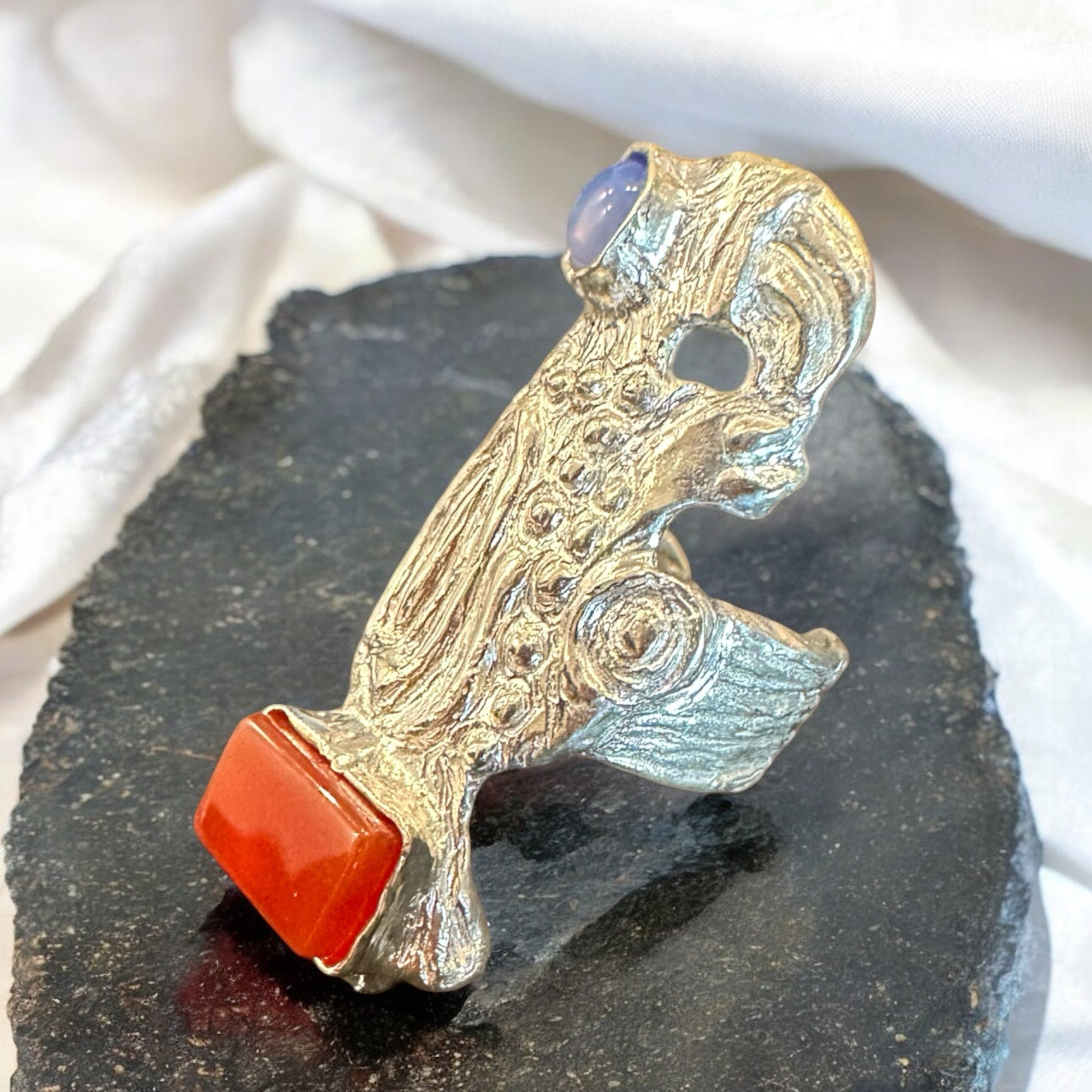 Its eye softly gleams with Blue Lace Agate, while its tail is set ablaze with warm Carnelian.