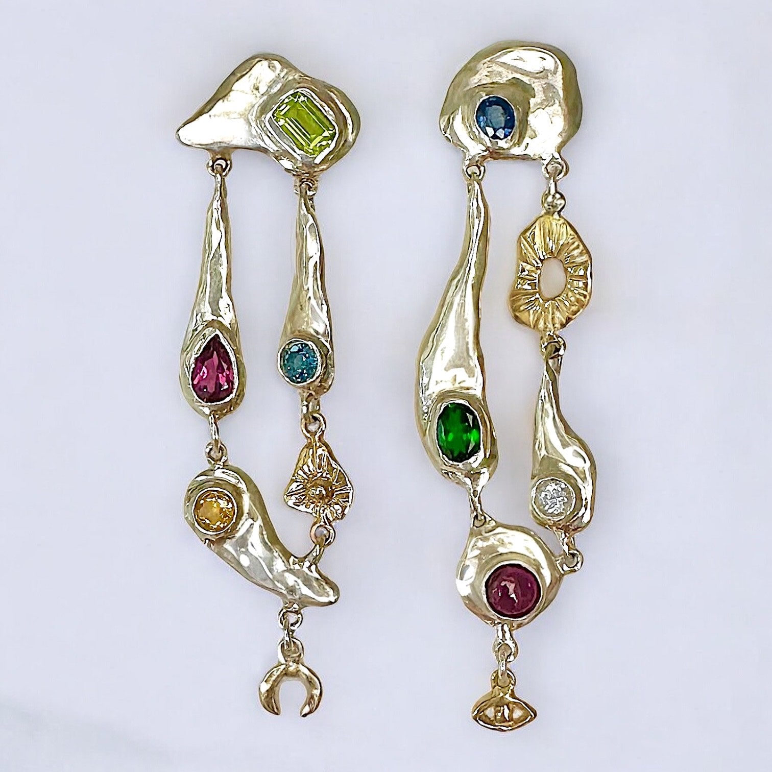Sterling silver and 14Κ gold earrings adorned with precious stones — sapphire, citrine, prasiolite, sky-blue topaz, peridot, tourmaline, rhodolite, and moissanite.