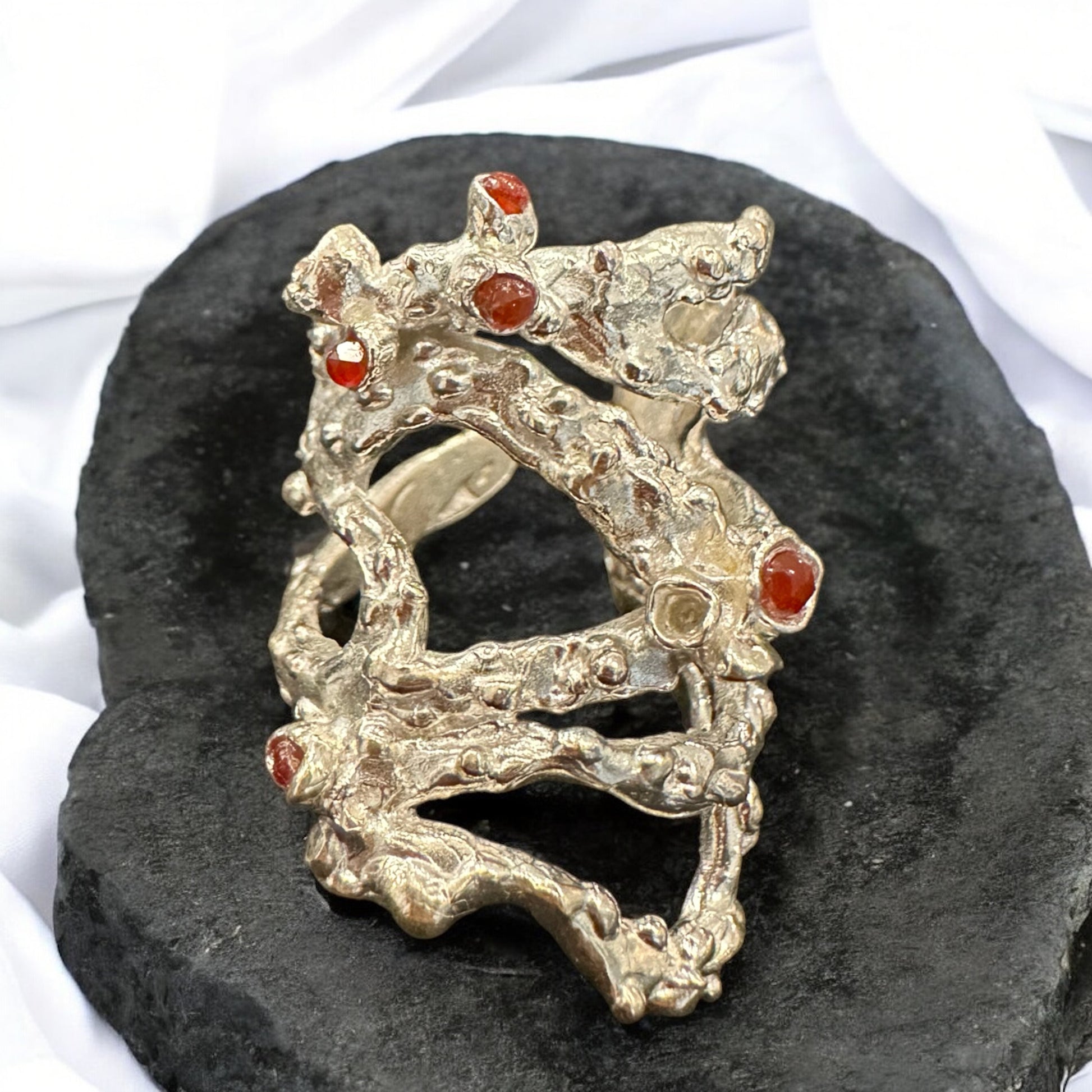 Tiny flowers bloom from the metal, each one holding the warm glow of carnelian at its heart.