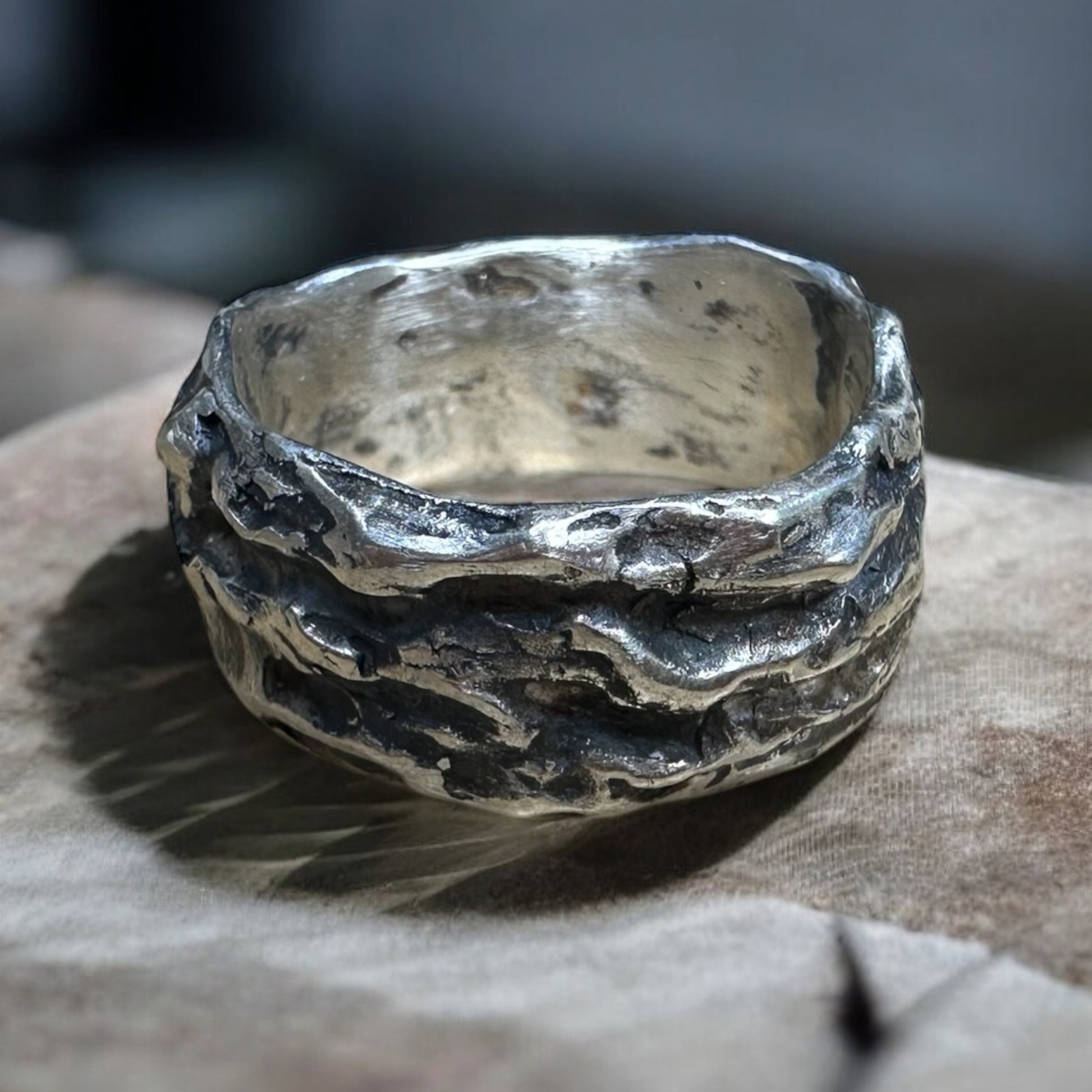 A handcrafted ring in sterling silver with a rugged, layered surface.