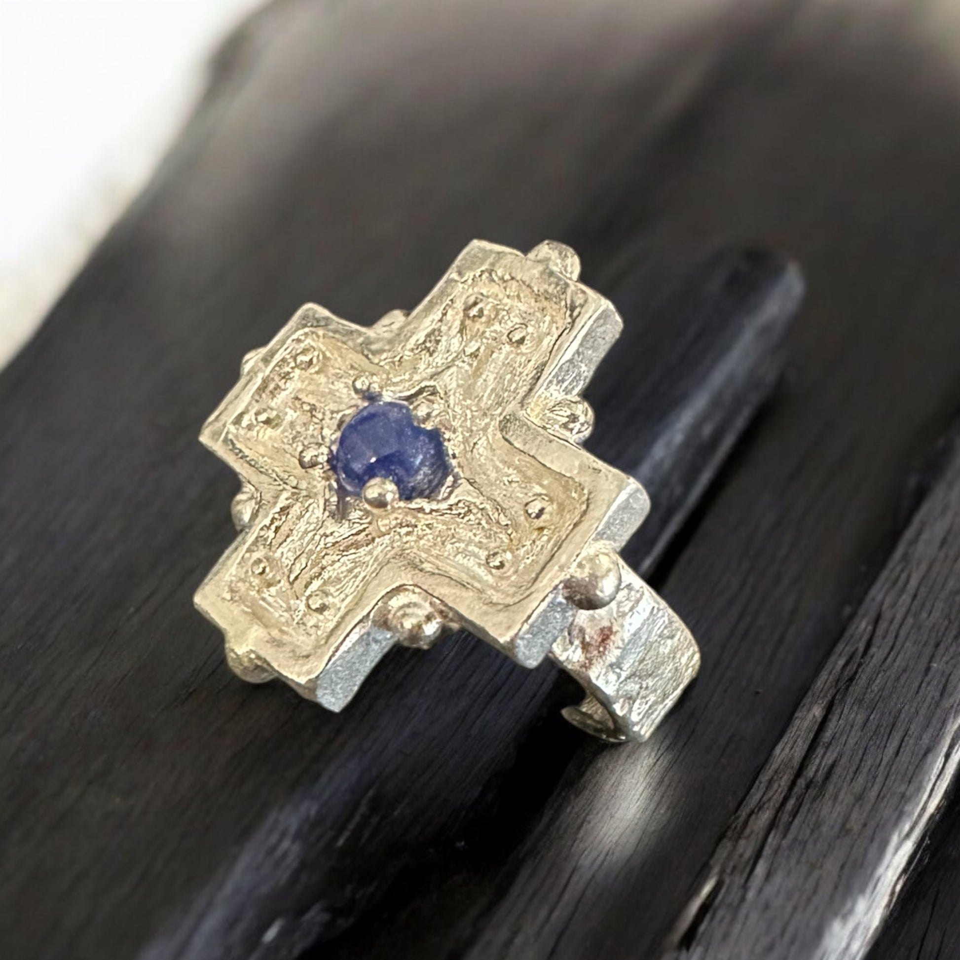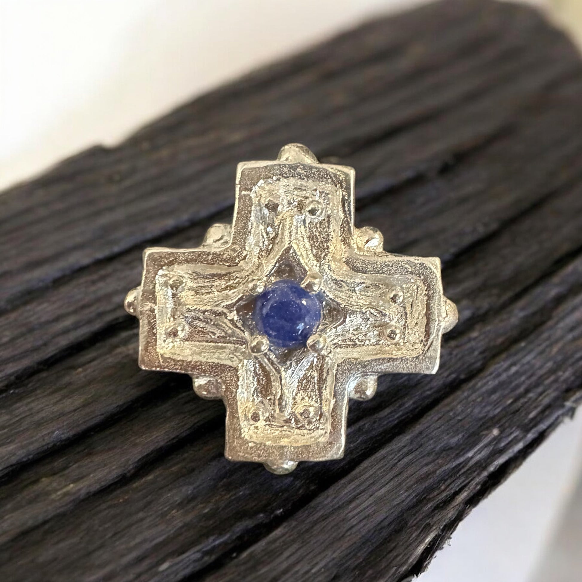 At the center, a small stone — red coral or sodalite — like a trace of a moment that changed direction.