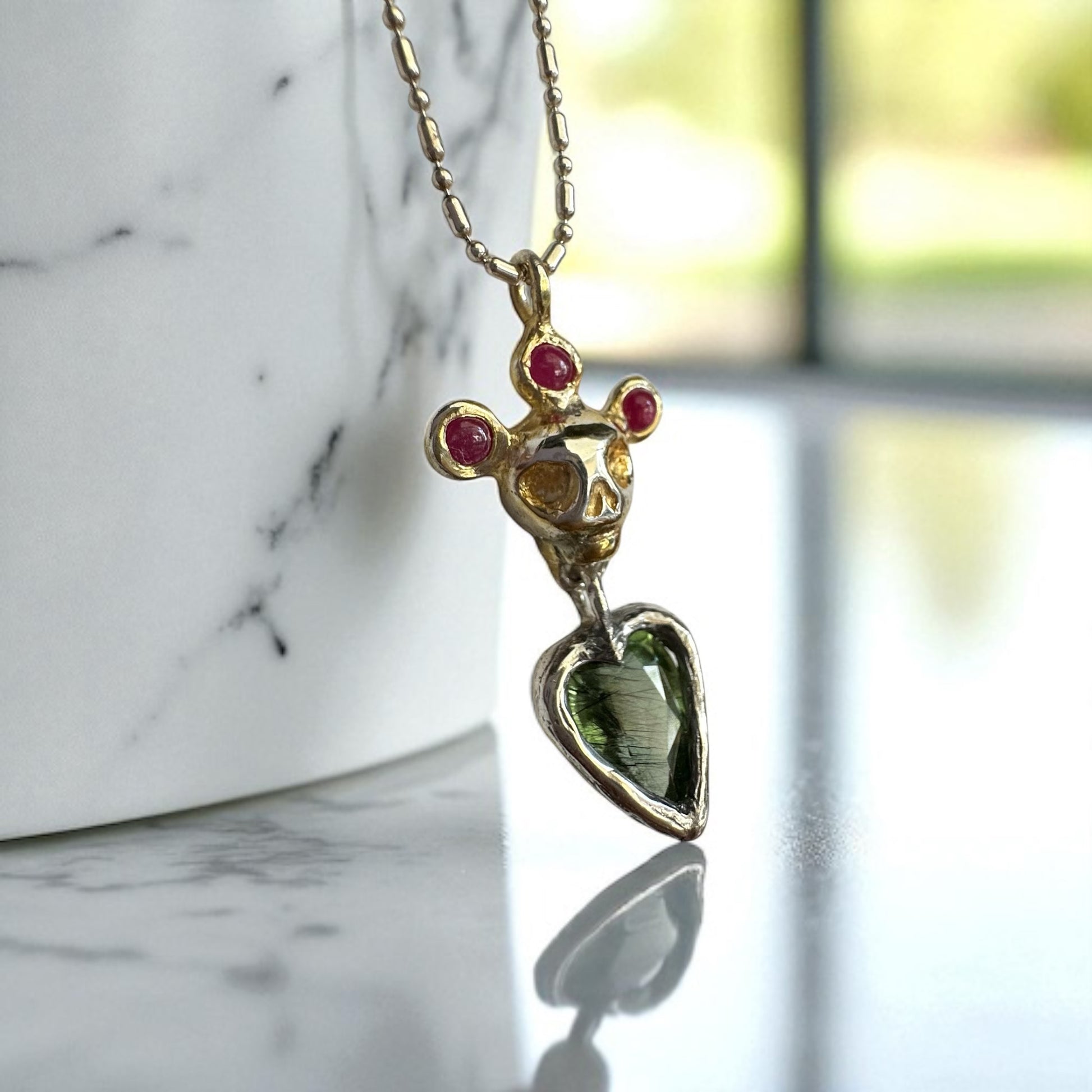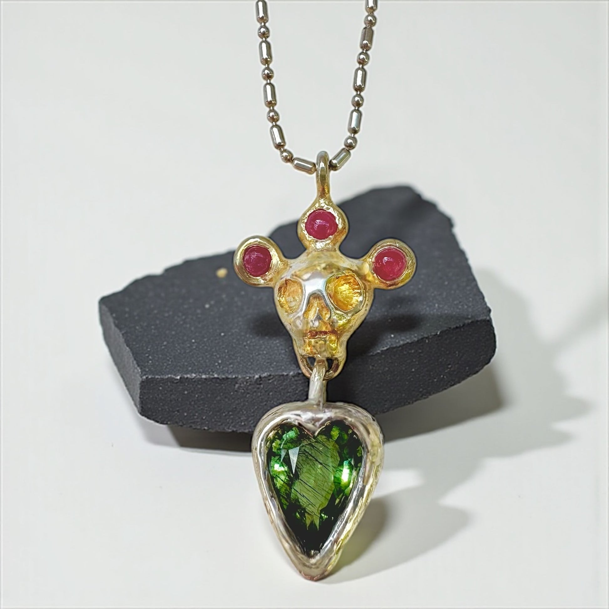 Three rubies radiate like drops of blood, while a green peridot with rutile brings an earthy balance to the drama.