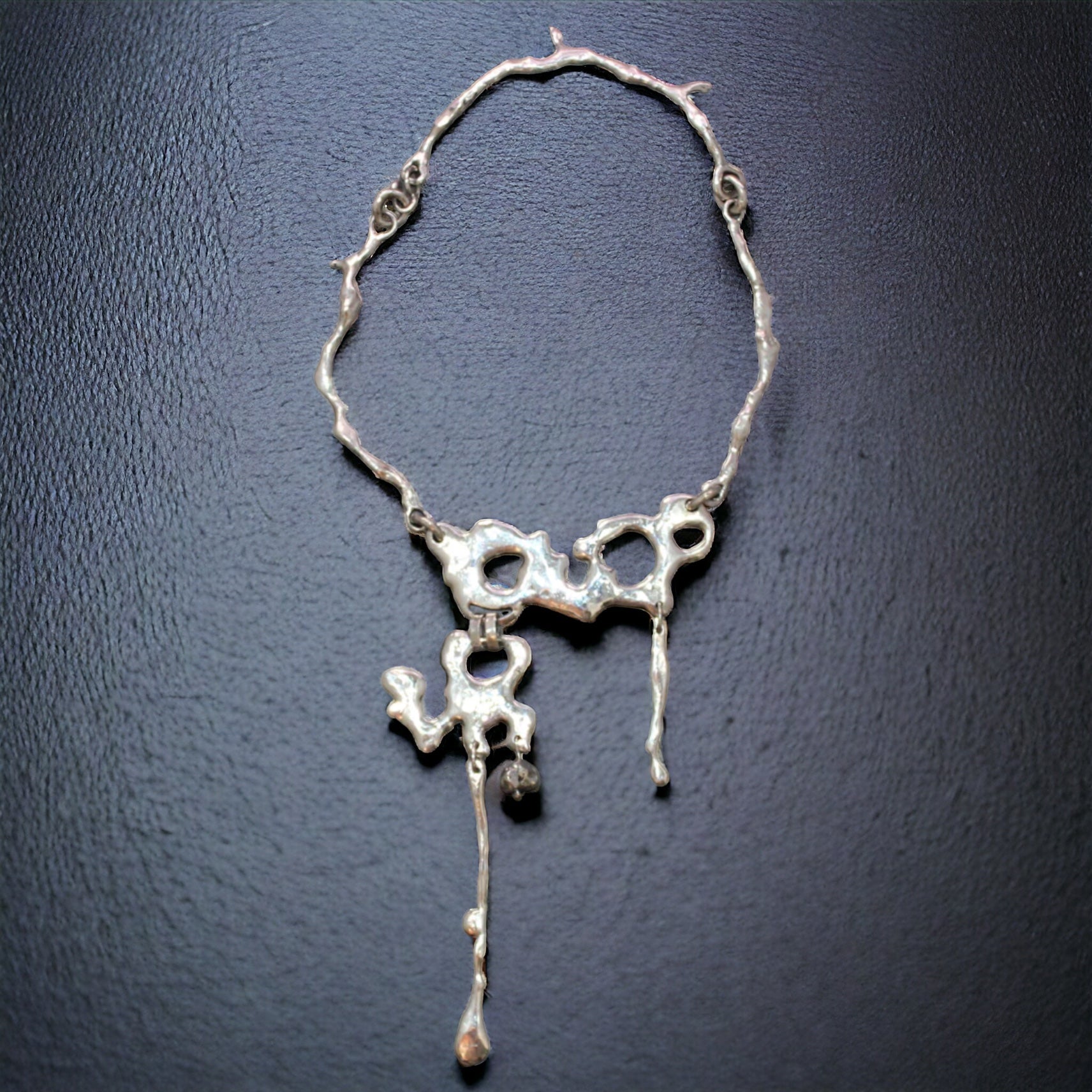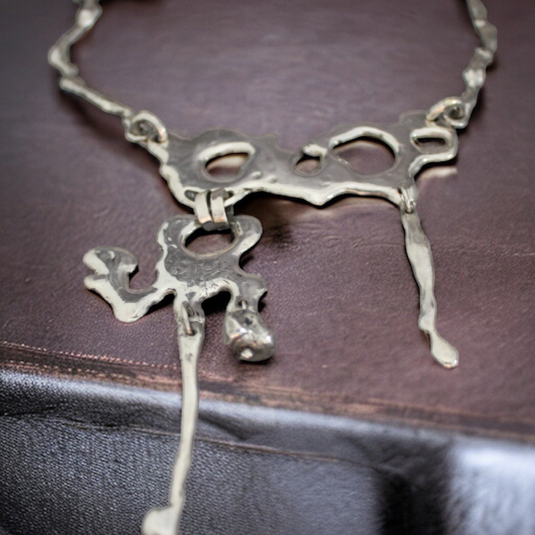 Handcrafted abstract silver necklace, reminiscent of melting wax droplets. Organic, minimal, and distinctive, designed to softly embrace the neck like molten metal frozen in time.
