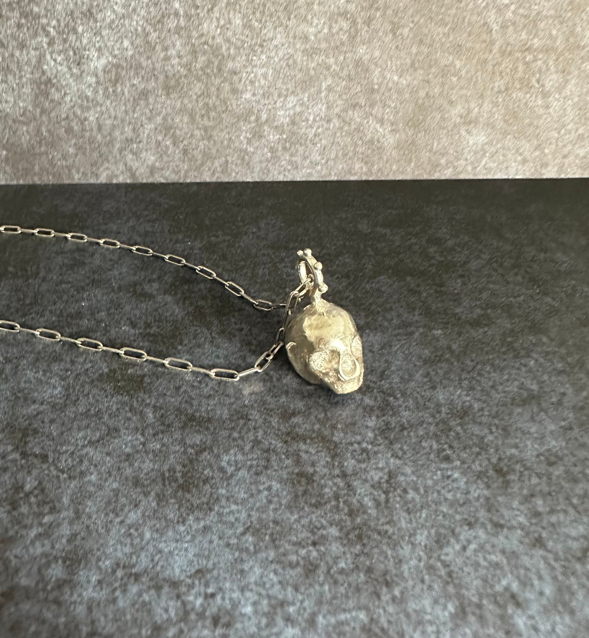 A handcrafted necklace featuring a skull pendant hanging from a mohawk-shaped ring.