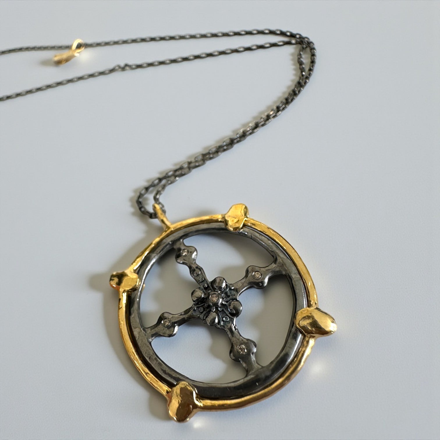 A round sterling silver pendant with 22K gold plating and a black rhodium finish, evoking an ancient silver-and-gold amulet inspired by sacred symbols of the past.