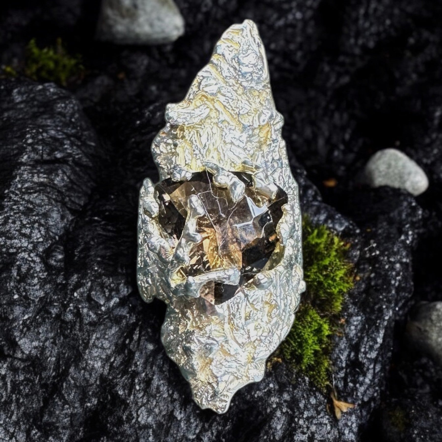 Handcrafted sterling silver ring with 22K gold plating and a natural smoky quartz stone in trillion cut, lightly abraded for a two-tone finish.