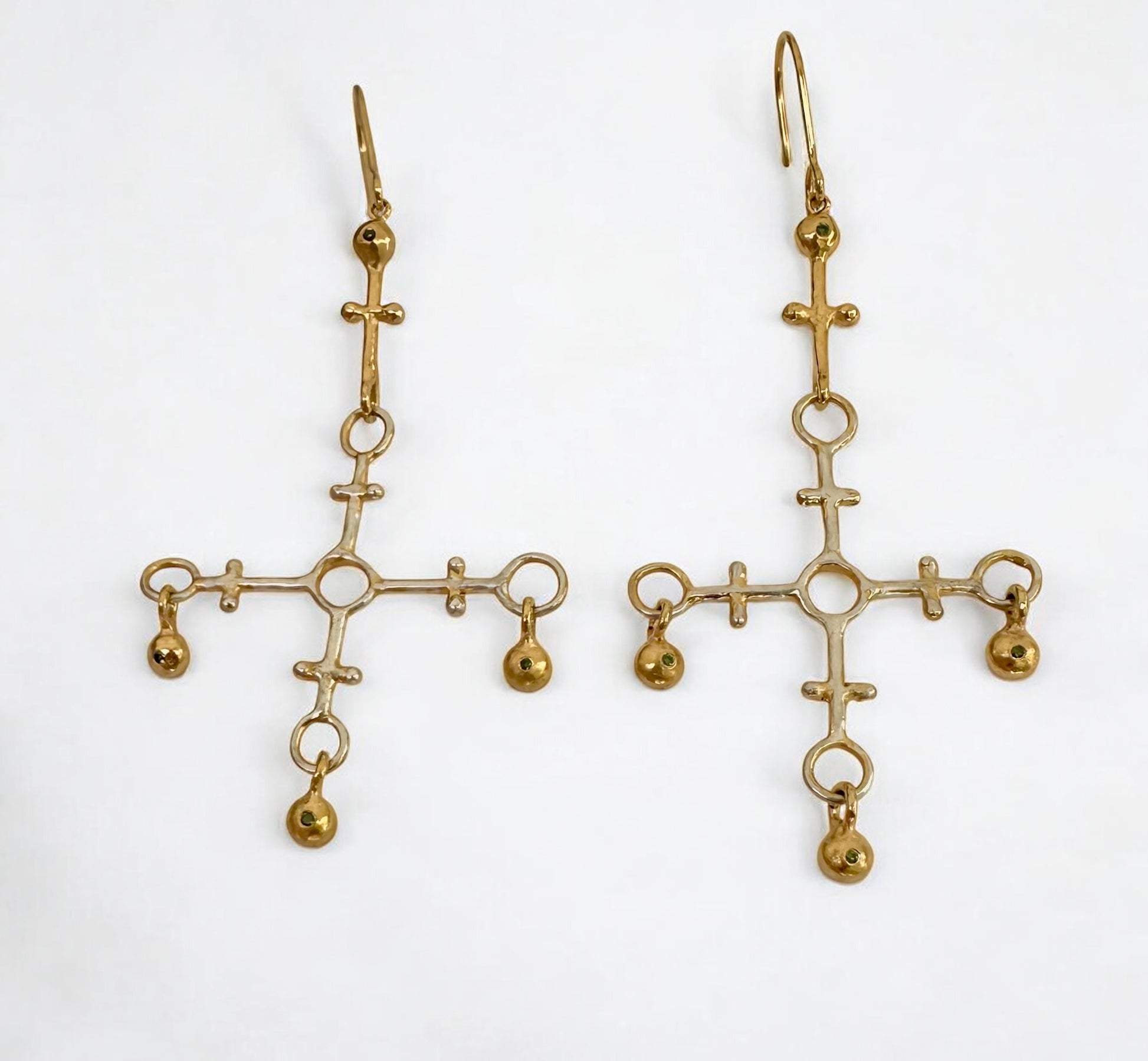 Gold-plated sterling silver cross earrings set with green diamonds.