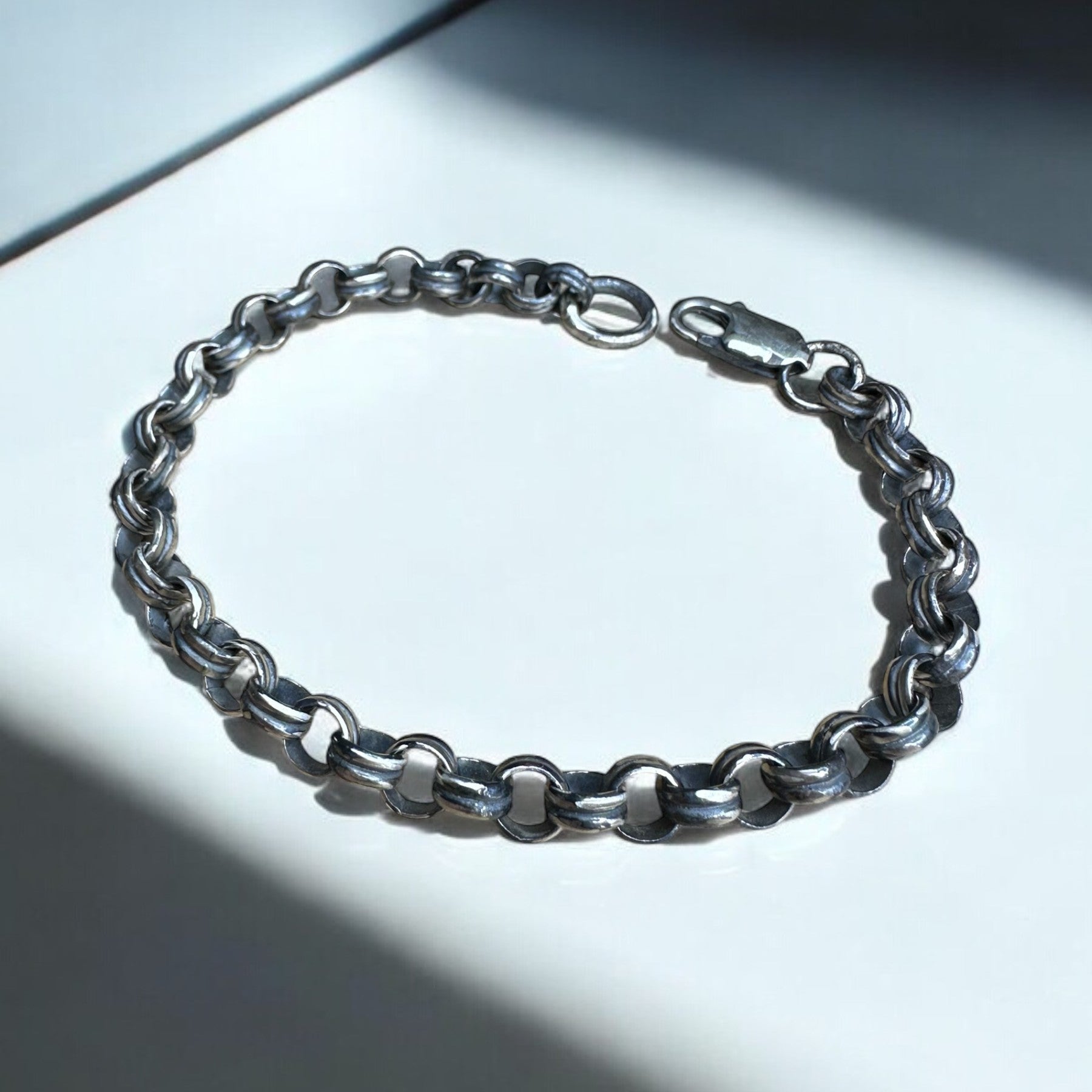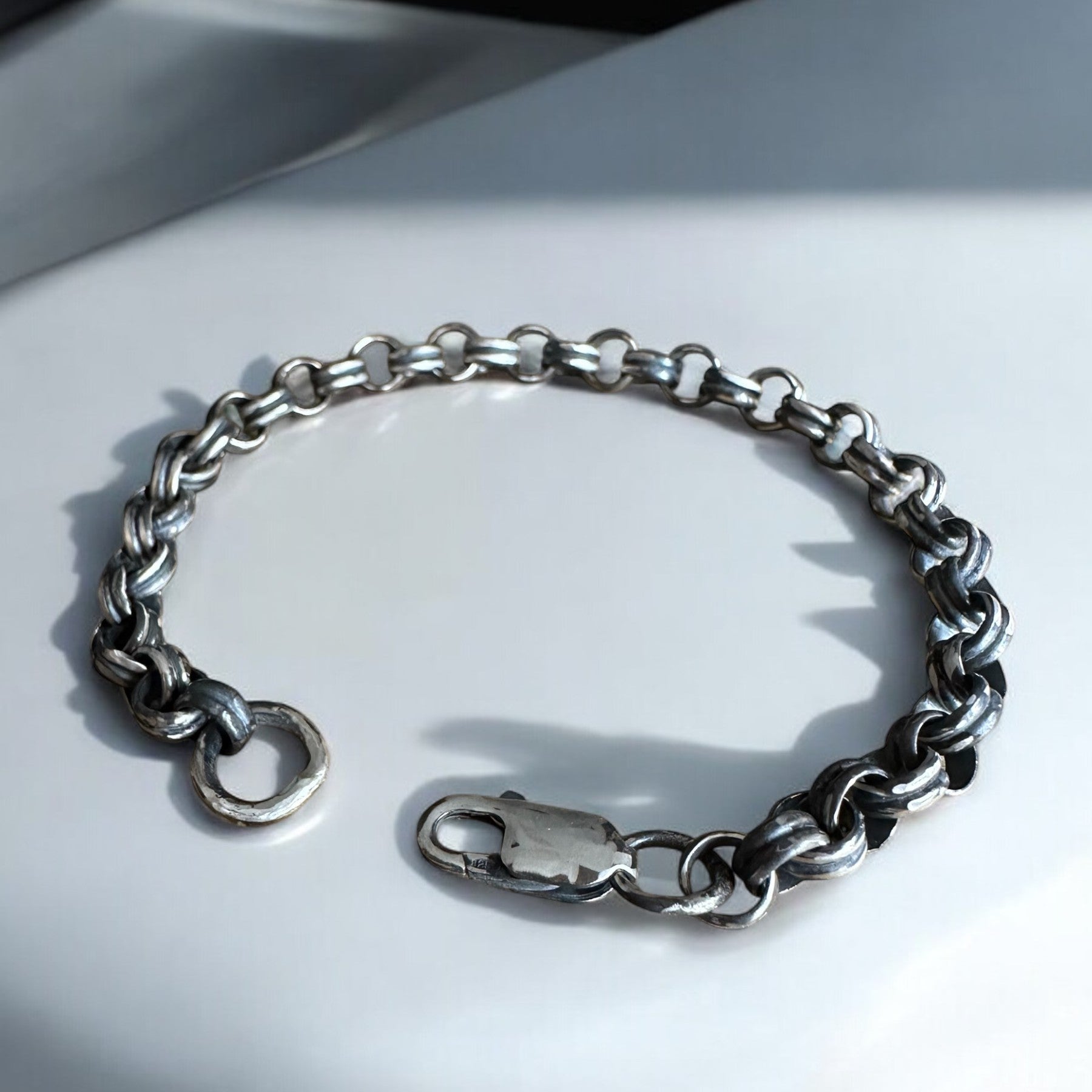 Handcrafted sterling silver chain bracelet forged from solid, hammered links with a dark oxidized finish.
